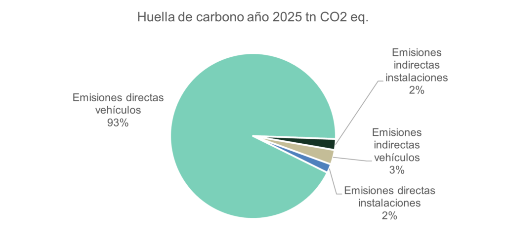 Las emisiones se corresponden en mayor medida por las derivadas de los vehículos de la flota, que suponen el 93% sobre el total de la huella de carbono, mientras que el resto se refieren a las emisiones directa de instalaciones (caldera de gas) e indirectas por consumo eléctrico de autobuses e instalaciones de la empresa, elementos de movilidad vertical, Biki y Parkibici.