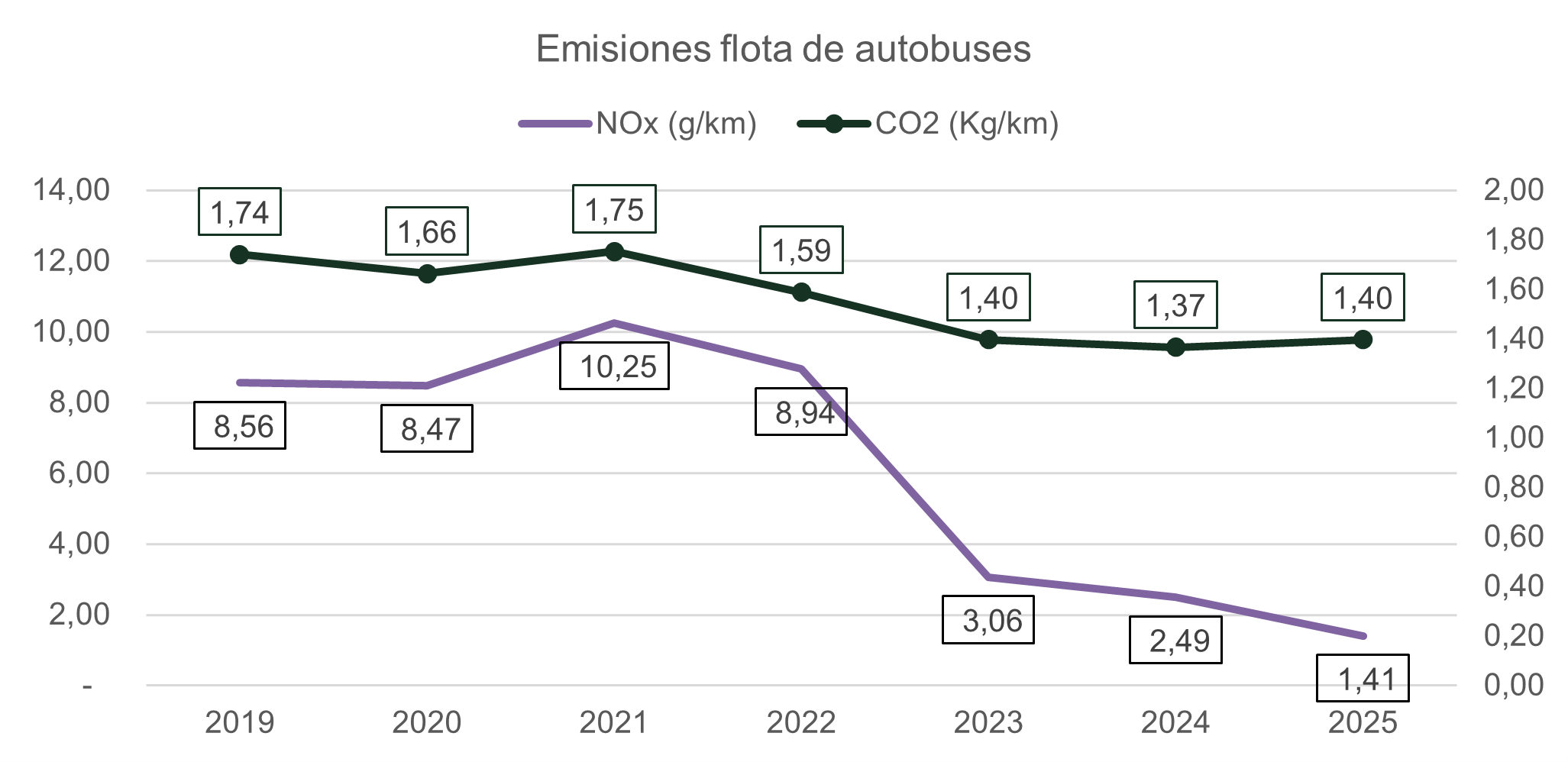 En este sentido, con la incorporación de los seis nuevos autobuses articulados accionados por GNC en el año 2025 se han retirado del servicio tres autobuses diésel Euro IV, lo que ha contribuido a reducir las emisiones contaminantes en un 12% para partículas y del 44% y 25% respectivamente para NOx y HC, mientras que las emisiones de CO2 son similares al año anterior.