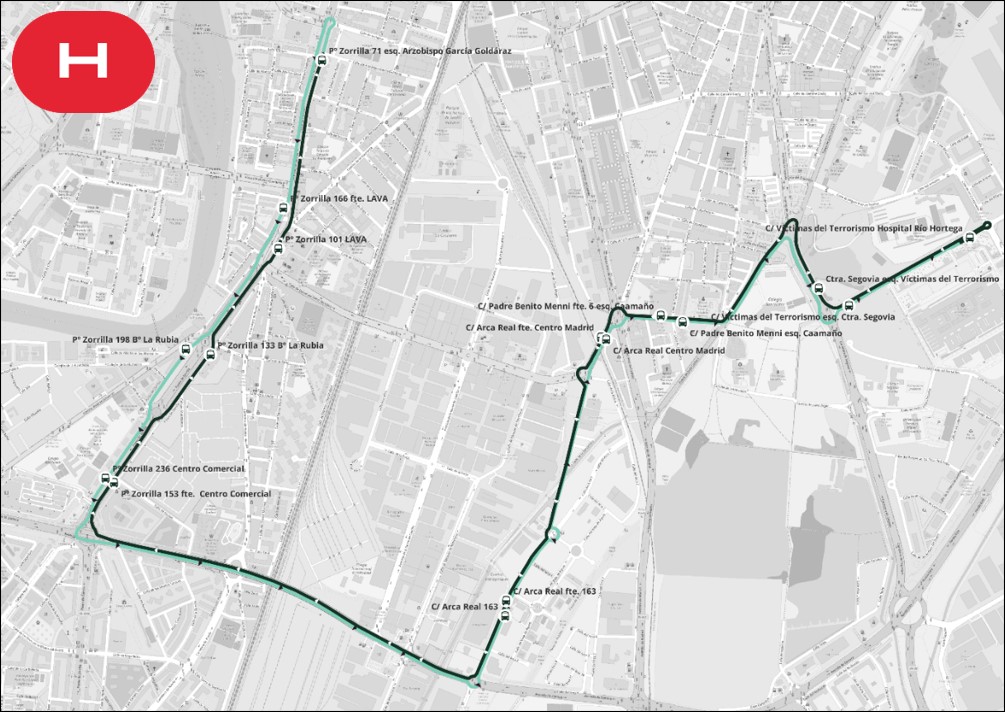 El nuevo trazado de la línea H, tanto de ida como de vuelta, se desplaza hacia la zona residencial de Arcas Reales y además se crean dos nuevas paradas en C/ Arca Real 163 (sentido Delicias/Hospital Río Hortega) y C/ Arca Real frente al número 163 (sentido P.º Zorrilla).