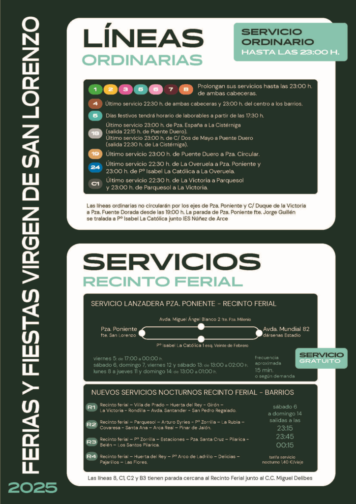Por este motivo, se prestará servicio con una línea lanzadera desde la Plaza de Poniente a las inmediaciones del recinto ferial (dársenas del Estadio José Zorrilla), con salidas cada 15 minutos (o según demanda) y servicios hasta las 2 de la madrugada los días sábado 6, domingo 7, viernes 12 y sábado 13, y hasta la una de la madrugada del lunes 8 al jueves 11 y el domingo 14. Los primeros servicios comenzarán todos estos días a las 13:00 h. en pza. Poniente.