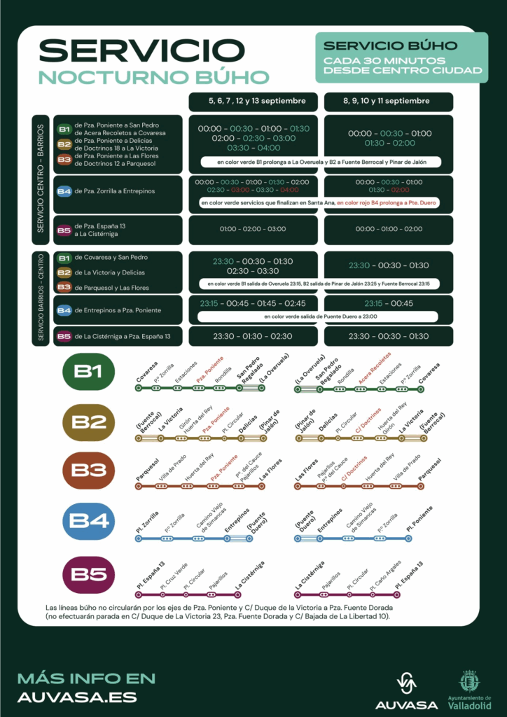 Por lo tanto, los días 5, 6, 7, 12 y 13 de septiembre los búhos B1, B2, B3 y B4 saldrán de la zona centro cada 30 minutos desde las 00:00 h. y hasta las 04:00 h, mientras que el resto de los días lo harán de 00:00 h. a 02:00 h.