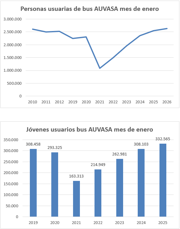 Una vez conocidas las cifras de utilización de los autobuses de AUVASA en 2025 superando ampliamente el objetivo de los 30 millones, en concreto 30.737.721, AUVASA ha publicado la estadística de enero. Durante este mes, continua el crecimiento de este servicio público, alcanzando los 2.628.645. Esto ha supuesto un incremento del 3,4% respecto al mes de enero año anterior y la mayor cifra de utilizaciones de los últimos dieciséis años, encarando el año con el objetivo de alcanzar los 31 millones de personas usuarias.