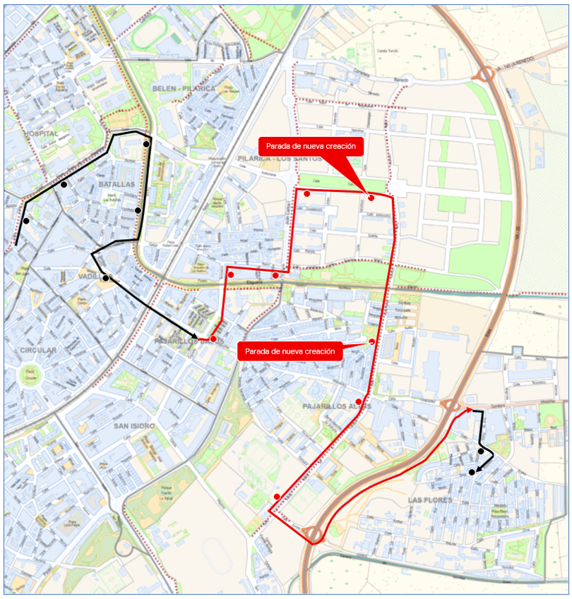 Por lo tanto, el barrio de Santos Pilarica contará con dos nuevas paradas en cada sentido del servicio nocturno en c/ Cometa con el búho 3, que además mejora la cobertura y recorridos actuales en el entorno de c/ Aguanieves y c/ Santa María de la Cabeza, con trazados, en este último caso, similares a los de la línea 3.