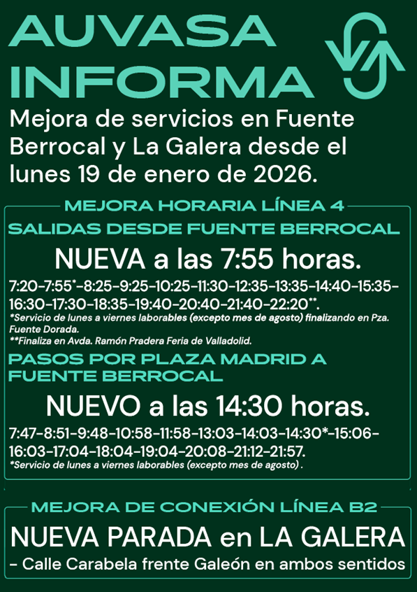 En días laborables, una nueva expedición partirá del barrio de Fuente Berrocal a las 07:55h. con destino pza. Fuente Dorada, lo que permitirá disponer de frecuencia de 30 minutos en la primera hora de la mañana en la que se producen más desplazamientos al centro de la ciudad. De igual modo, al mediodía se prestará un nuevo refuerzo con salida de Plaza Madrid a las 14:30h. hacia Fuente Berrocal.