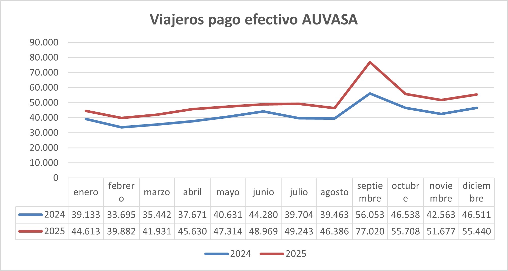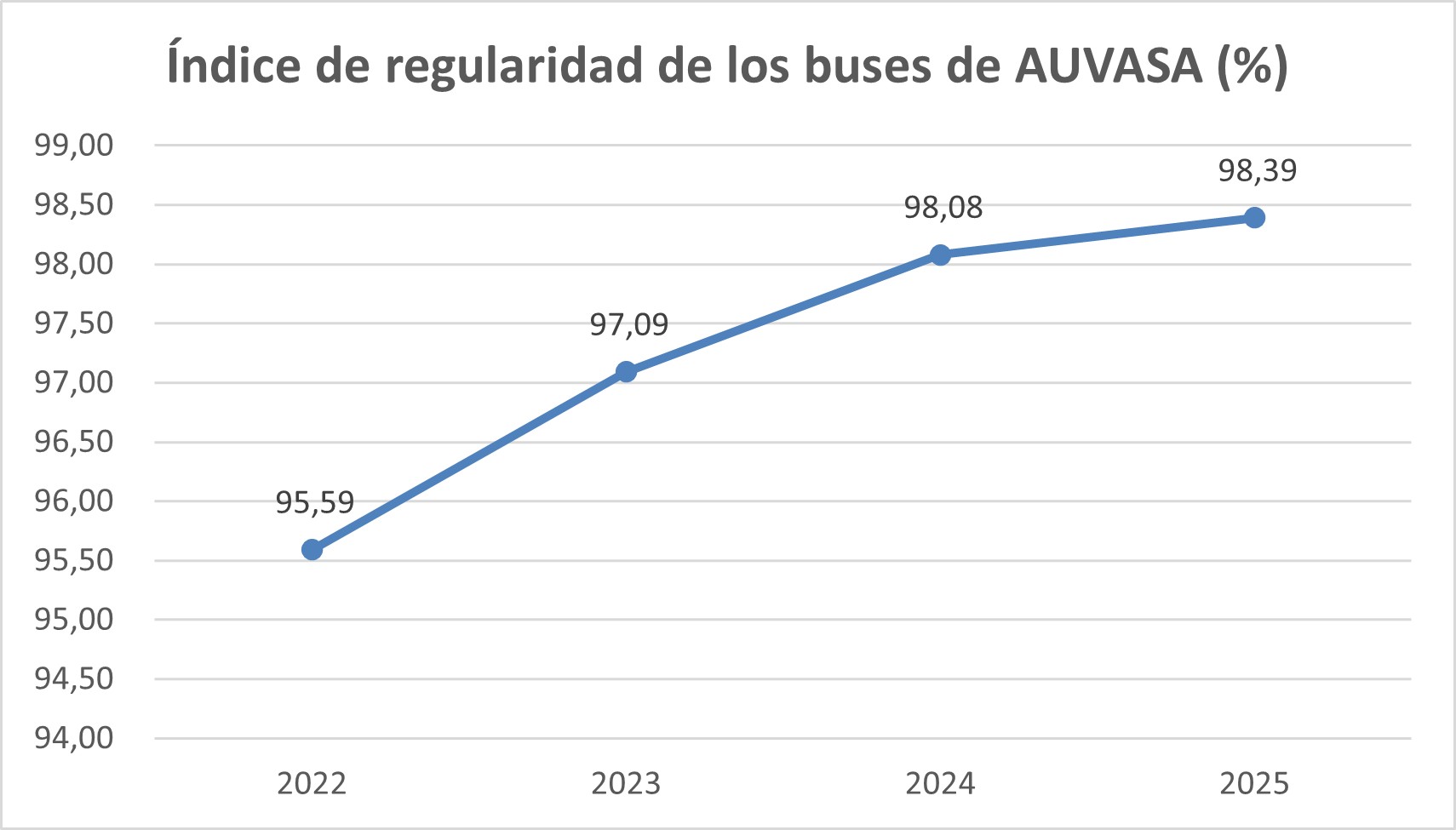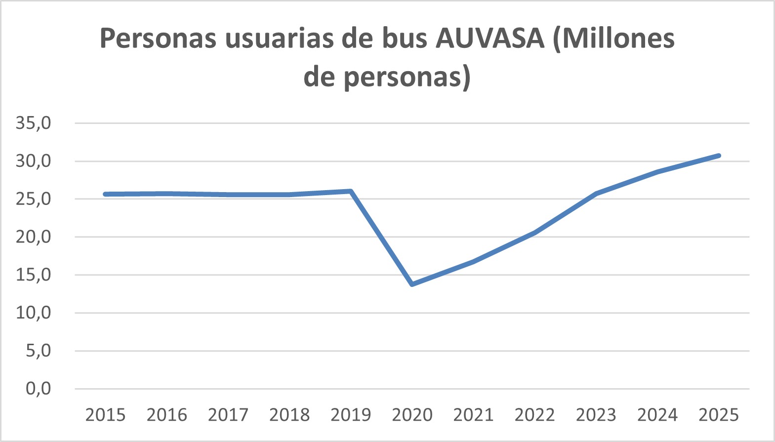 AUVASA ha cerrado las cifras de utilización del servicio de autobuses en 2025, superando ampliamente el objetivo de los 30 millones de personas usuarias que se tenía previsto, en concreto 30.737.721. Esto ha supuesto un incremento del 7,5% respecto al año anterior y la mayor cifra de utilizaciones de los últimos dieciséis años. Este crecimiento supone en términos absolutos 2,1 millones más que en el año 2024, con un crecimiento que supera la media nacional del transporte urbano en autobús (los últimos datos publicados el crecimiento nacional está en el 6,8%).