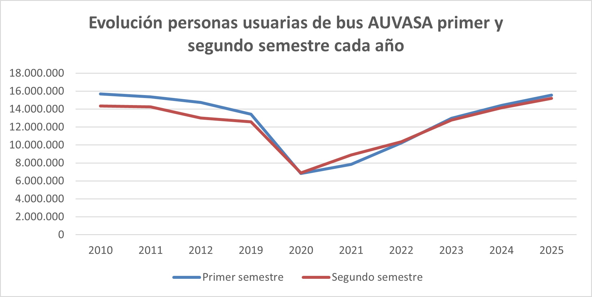 El crecimiento que se está experimentando denota también un cambio de tendencia en la utilización del servicio público. Tradicionalmente, por el periodo estival, el primer semestre del año es el que más utilización del bus tenía, de media 14,8 millones de personas. El mencionado crecimiento en este periodo del año ha llevado a que en 2025 hayan sido 15,5 millones, esto supone un incremento de 4,7%. En el segundo semestre, tradicionalmente eran 13,5 millones, sin embargo, en 2025, en este periodo se ha utilizado por 15,2 millones, con un crecimiento del 12,6%. Esto significa que ahora esa importante diferencia ya no se produce, se ha triplicado el uso, demostrando la confianza en el servicio prestado.